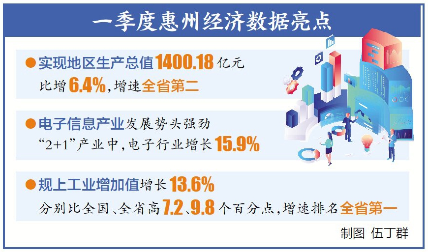 統計數據顯示,今年一季度,惠州規上工業增加值增長13.6%,分別比全國、全省高7.2、9.8個百分點,增速排名全省第一。