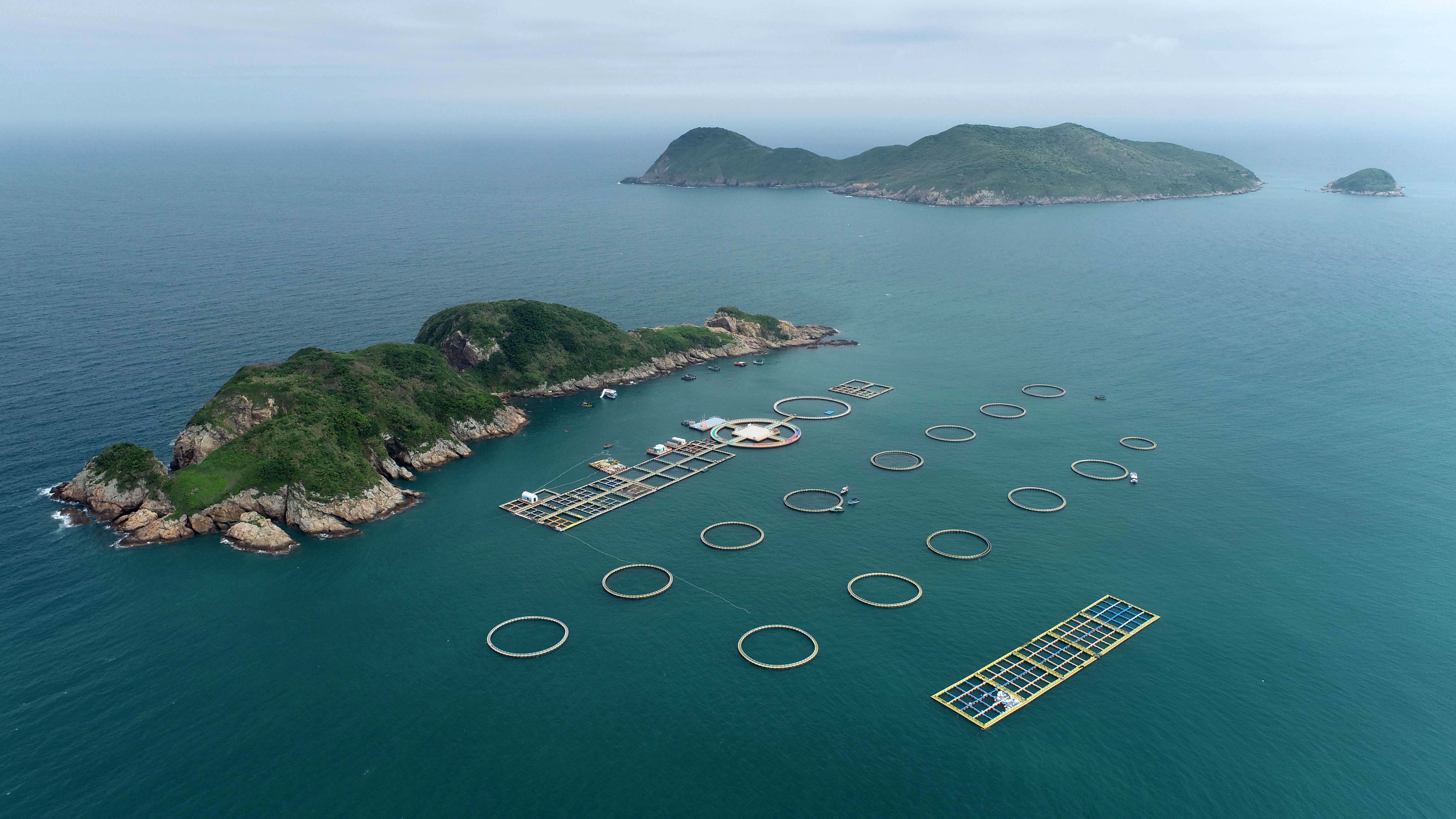 從高空俯瞰,惠東港口小星山附近壯闊的海面上排列著一個個“圓環”,這是一方海(廣東)海洋牧場有限公司的深海養殖設備。在這些直徑55米、深15米的深海網箱內,黃唇魚、海鱺、石斑、鮸魚、笛鯛等魚群暢快戲水。岸上的工作人員通過技術手段遠程監控水溫、水質等參數,不出海就能掌握網箱內的情況。
