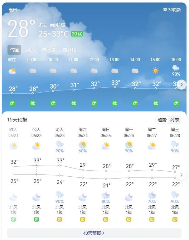 惠州日?qǐng)?bào)訊 (記者劉建威)惠州市氣象臺(tái)5月21日下午發(fā)布重大氣象信息,預(yù)計(jì)5月23~24日我市北部有大雨到暴雨,其余地區(qū)中雨局部暴雨,并伴有7~9級(jí)雷雨大風(fēng)、短時(shí)強(qiáng)降水和局地小冰雹等強(qiáng)對(duì)流天氣,最大小時(shí)雨強(qiáng)40~60毫米;25日,雨勢(shì)減弱,有小雨;26~27日,多云間陰天,局部有(雷)陣雨。