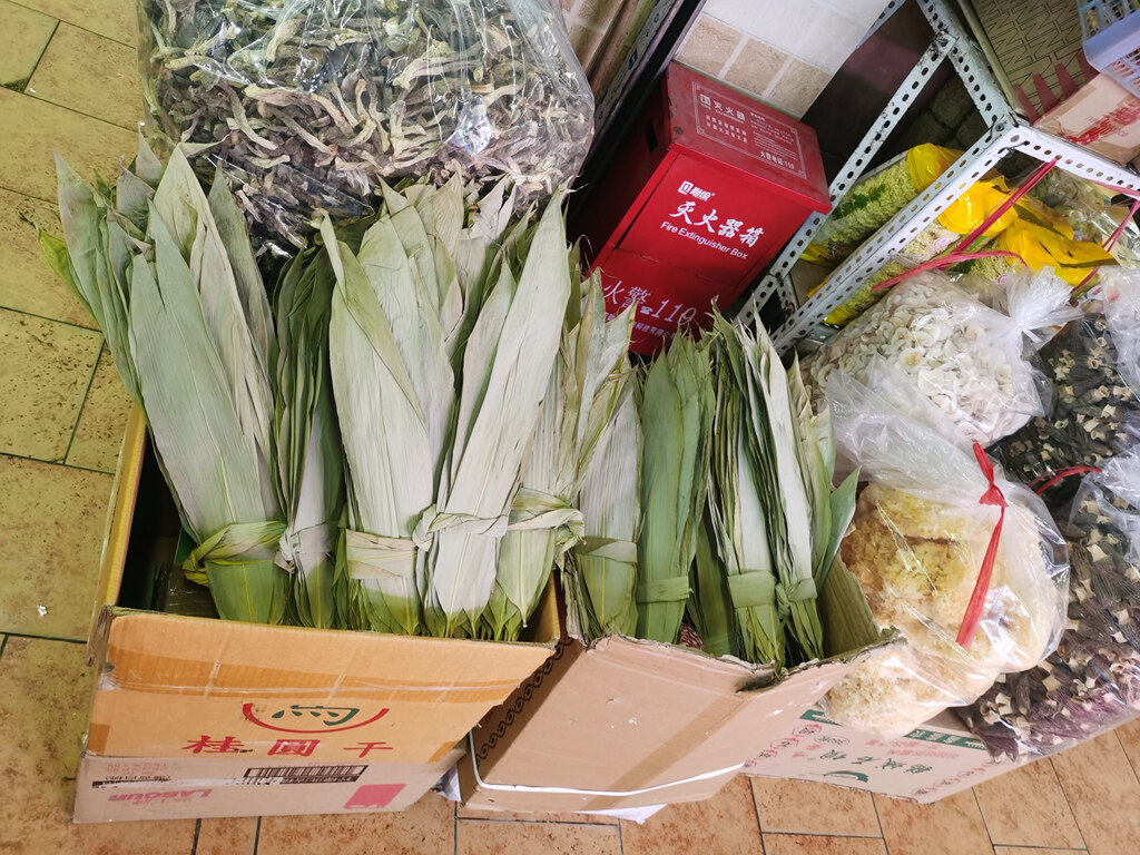 粽葉等包粽子的原材料被擺放在菜市場顯眼的位置。