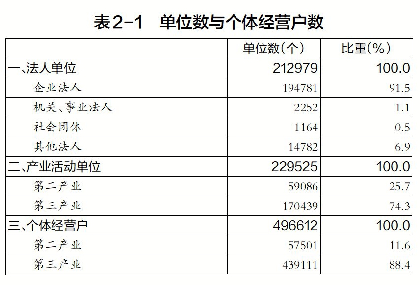 2023年末,全市共有從事第二產業和第三產業活動的法人單位212979個,比2018年末增加98015個,增長85.3%;產業活動單位[產業活動單位是法人單位的組成部分。僅包含一個產業活動單位的法人單位,稱為單產業法人單位,該法人單位同時也是一個產業活動單位;由兩個及以上產業活動單位組成的法人單位,稱為多產業法人單位。本公報中產業活動單位包括單產業法人單位和多產業法人單位下屬產業活動單位。]229525個,增加101549個,增長79.4%;個體經營戶496612個,增加157415個,增長46.4%(詳見表2-1)。