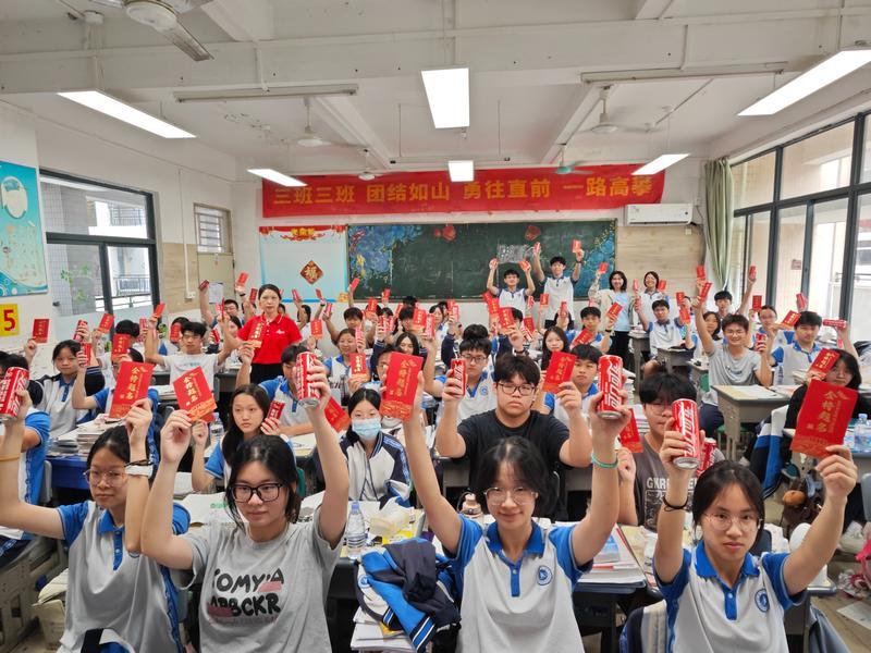 6月7日早上7時,惠州中學的高三班主任們便早早在宿舍集合,為考生提供叫醒服務,確保大家準時起床,以最佳狀態迎接考試。加油對聯、加油紅包、祈福香囊、定制鑰匙扣、公仔、徽章、可樂……老師們還準備了各式各樣的禮物為考生加油打氣。