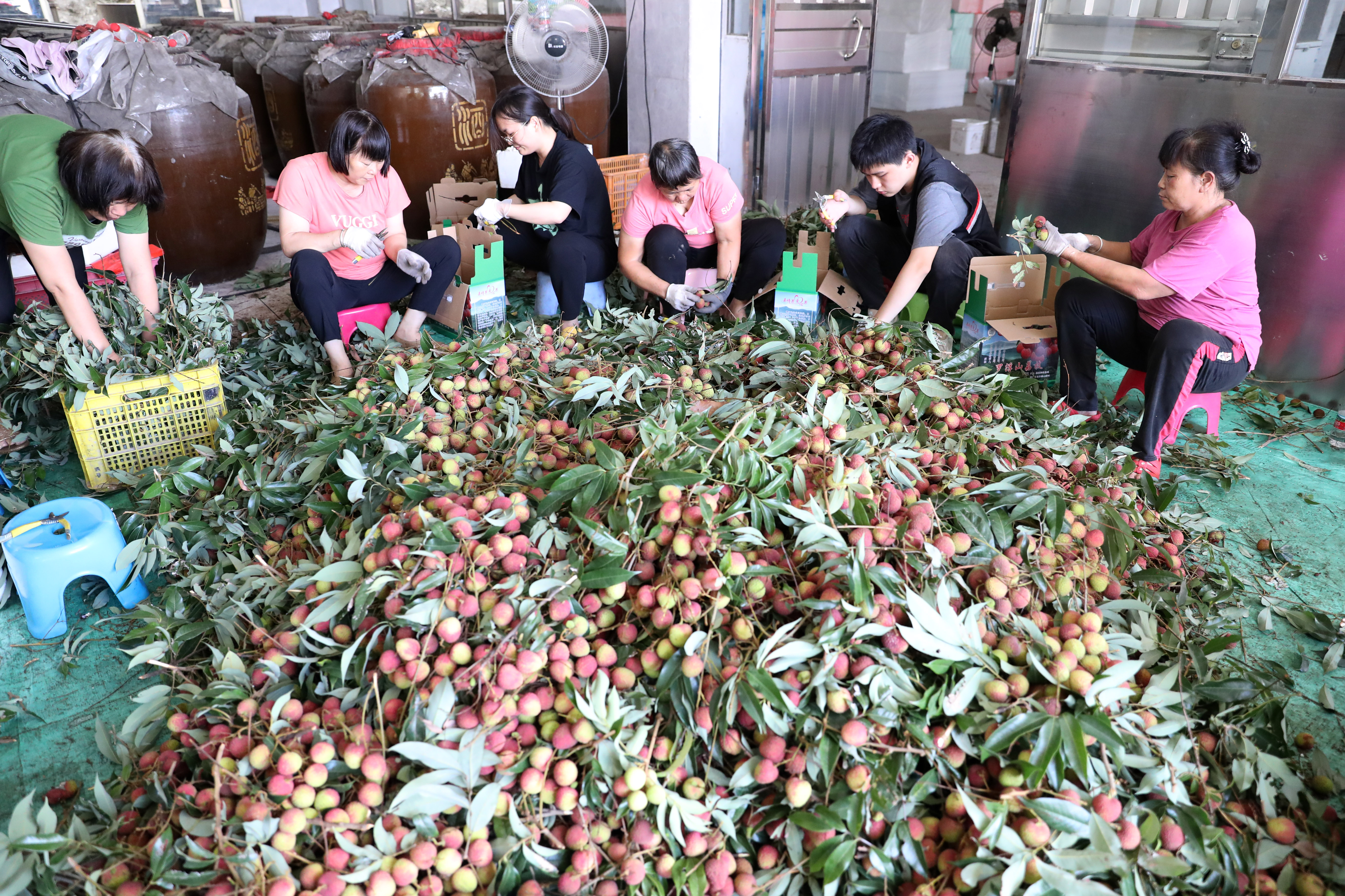 博羅縣龍華鎮山前村果農忙著給采收回來的荔枝修剪及打包。