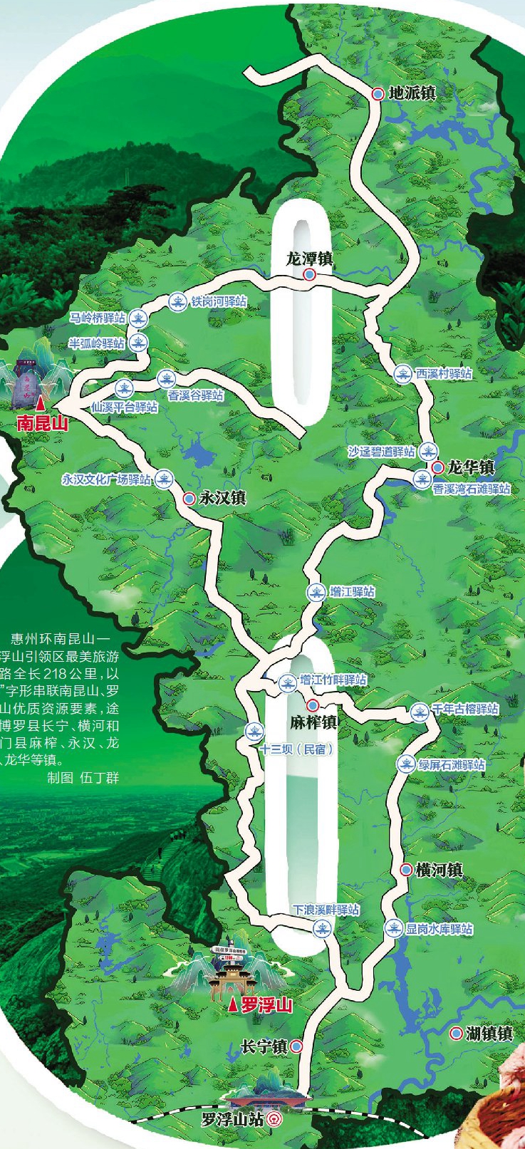 惠州環(huán)南昆山-羅浮山引領(lǐng)區(qū)最美旅游公路全長218公里,以“8”字形串聯(lián)南昆山、羅浮山優(yōu)質(zhì)資源要素,途經(jīng)博羅縣長寧、橫河和龍門縣麻榨、永漢、龍?zhí)、龍華等鎮(zhèn)。制圖 伍丁群