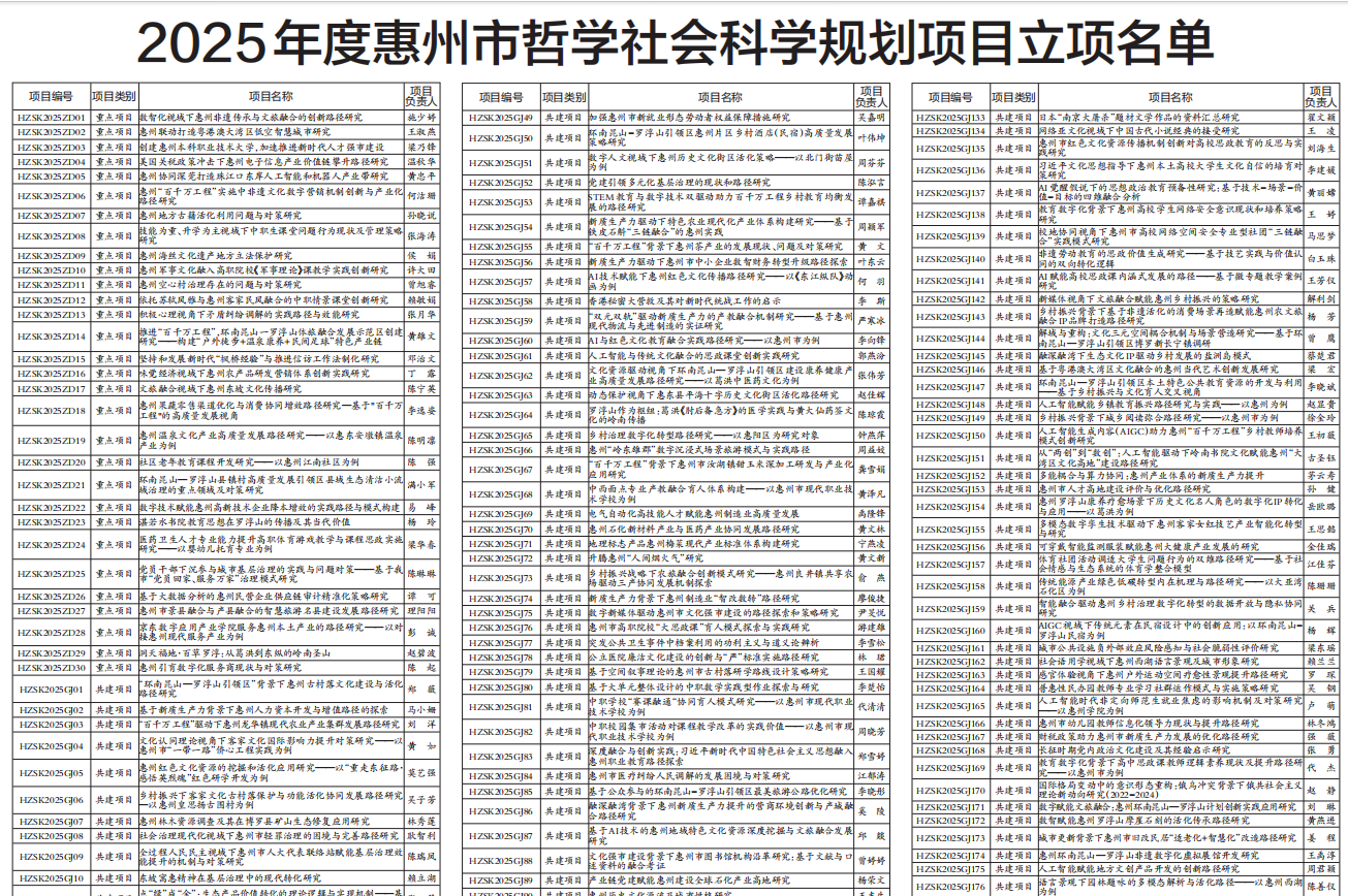 根據《惠州市哲學社會科學規劃項目管理制度》及《關于申報2025年度惠州市哲學社會科學規劃項目的通告》要求,經過嚴格的專家評審組評議、市社科聯黨組審議等程序,評出2025年度惠州市哲學社會科學規劃立項項目254項,其中重點項目30項,共建項目224項。現將立項名單予以公布。