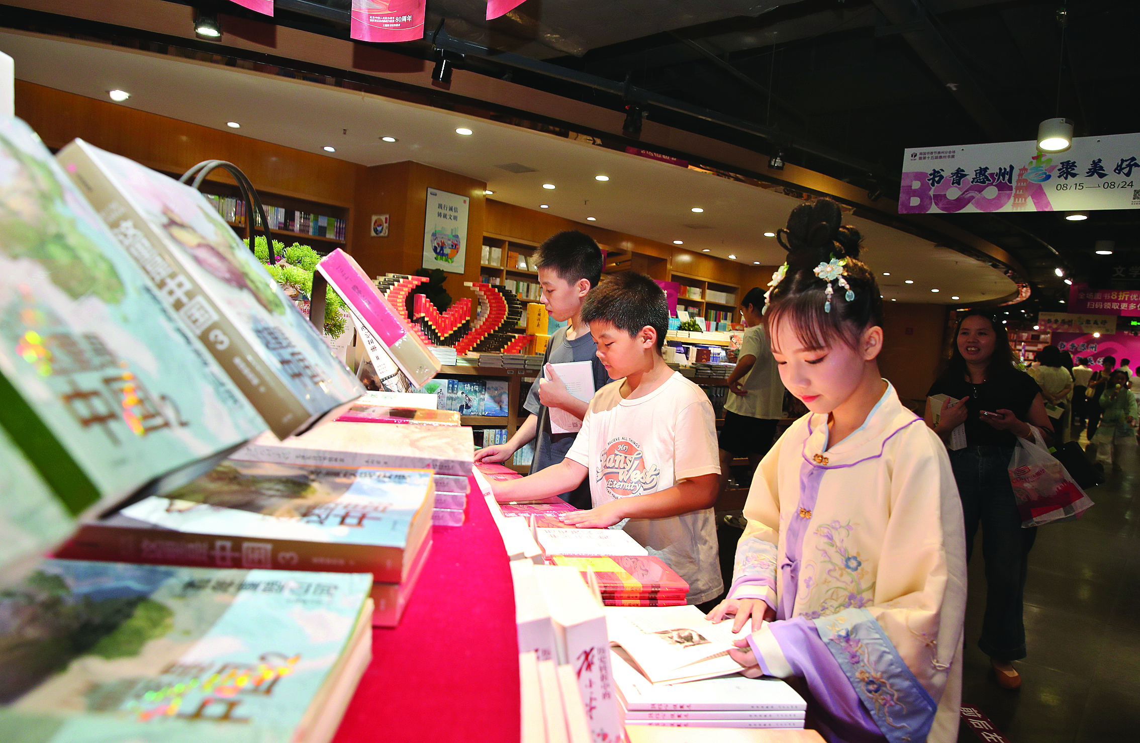 8月15日上午,一群小讀者在2025南國書香節惠州分會場暨第十五屆惠州書展閱讀圖書。惠州日報記者鐘暢新 攝