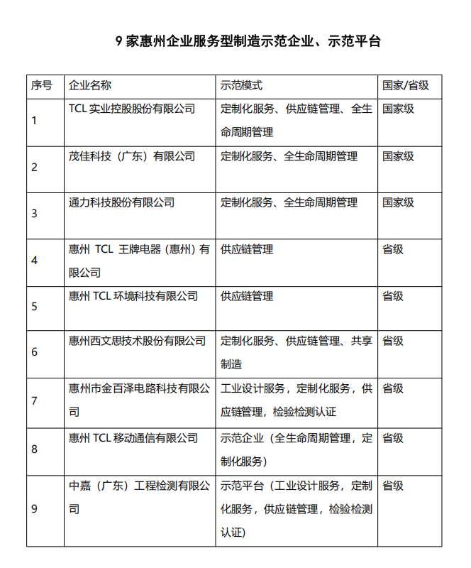 去年,惠州TCL移動通信有限公司、惠州市金百澤電路科技有限公司獲評省級服務型制造示范企業,中嘉(廣東)工程檢測有限公司獲評省級服務型制造示范平臺。