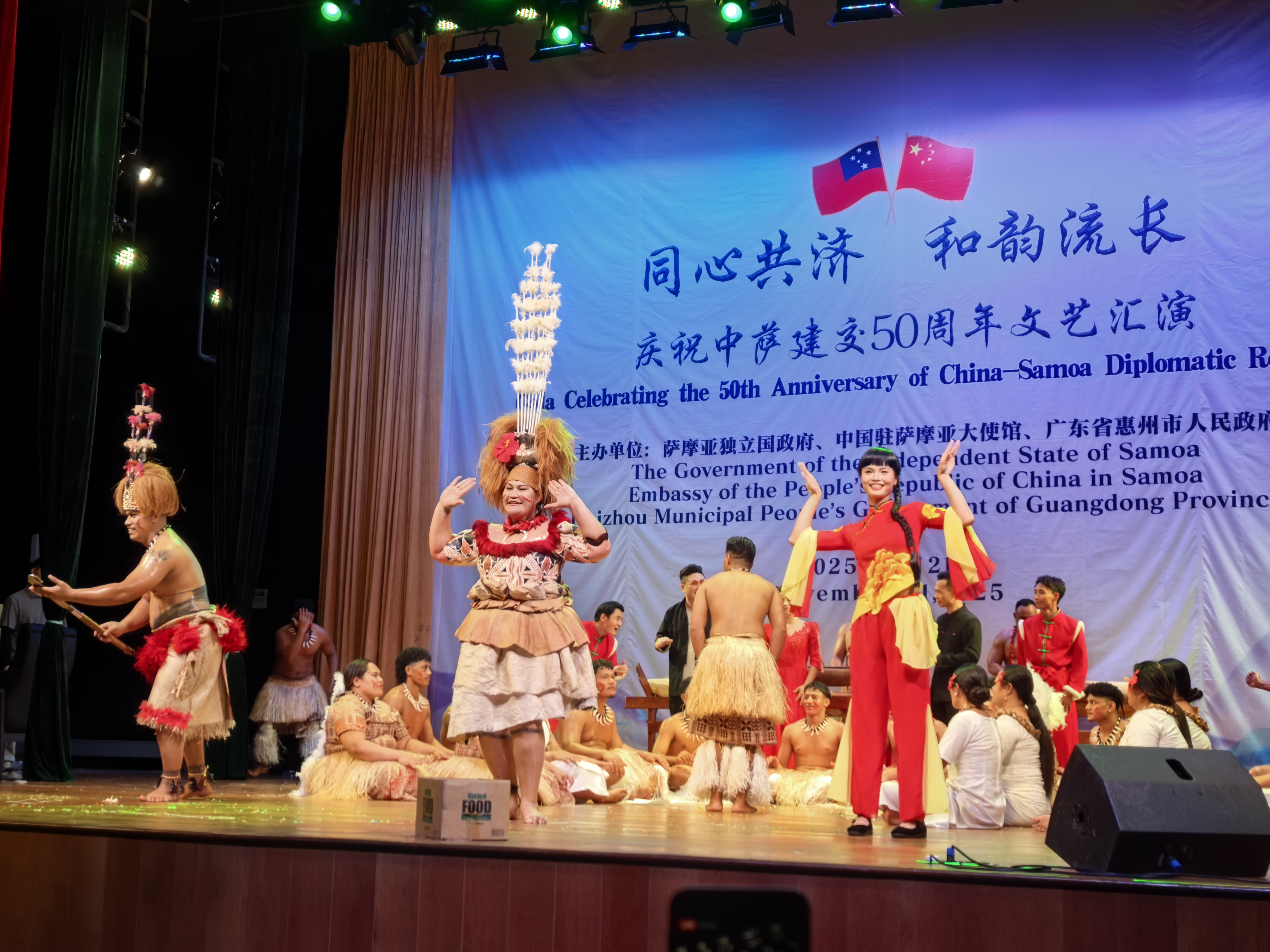 11月21日晚,“同心共濟 和韻流長”慶祝中薩建交50周年文藝匯演在薩摩亞文化藝術中心舉行。本次匯演由薩摩亞政府、中國駐薩大使館、惠州市政府聯合舉辦。