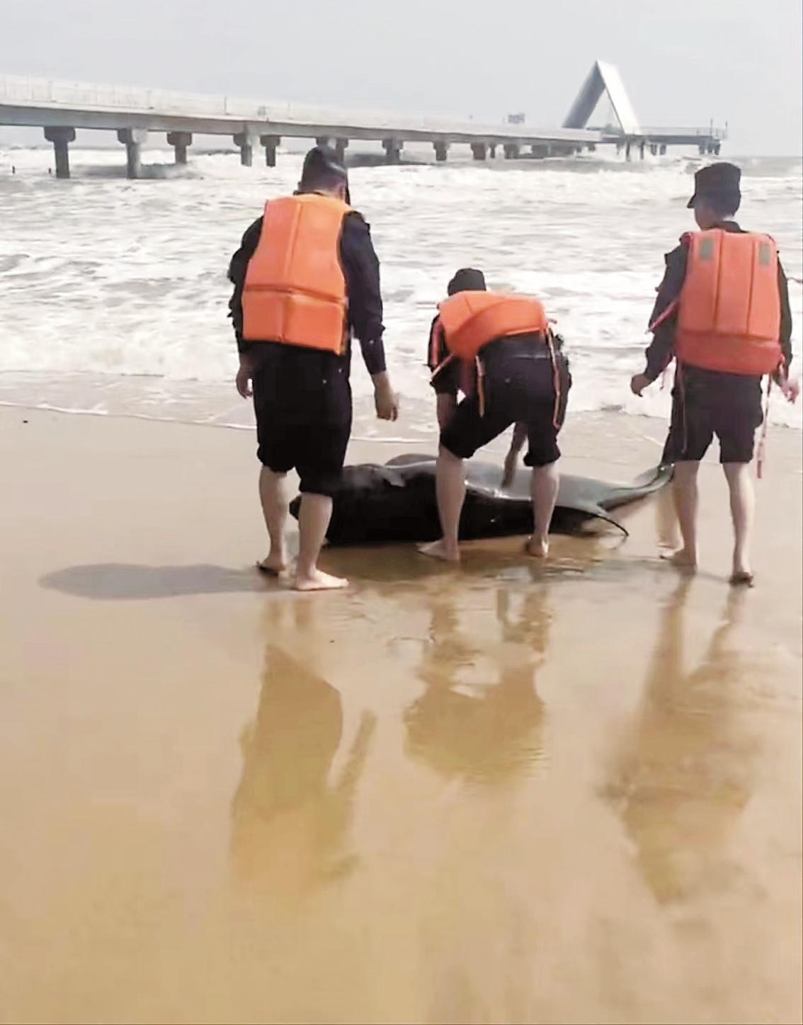 “鼎龍灣王村港海域有條大海豚擱淺,請趕快組織人員前來施救……”近日,湛江吳川市王村港鎮工作人員接到該市公安局110指揮中心轉來的信息后,立即組織10多人前往事發海域施救(見上圖),最終將海豚成功護送回大海。