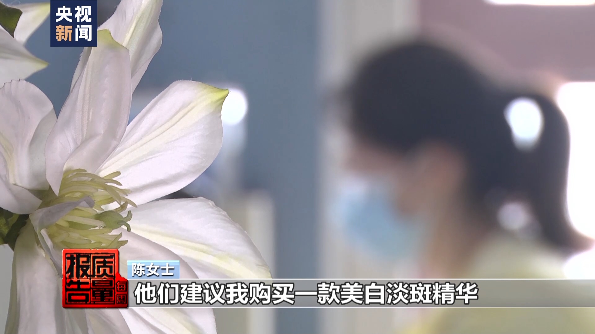 陳女士:在他們店做清潔補水的項目,他們建議我購買一款美白淡斑的精華,說我這個皮膚有一點點色斑,就在右邊。用他們的產品可以有淡斑還有預防新的斑長出來的效果,而且那個產品他們說是純中藥提取的,所以我當時聽了很心動。