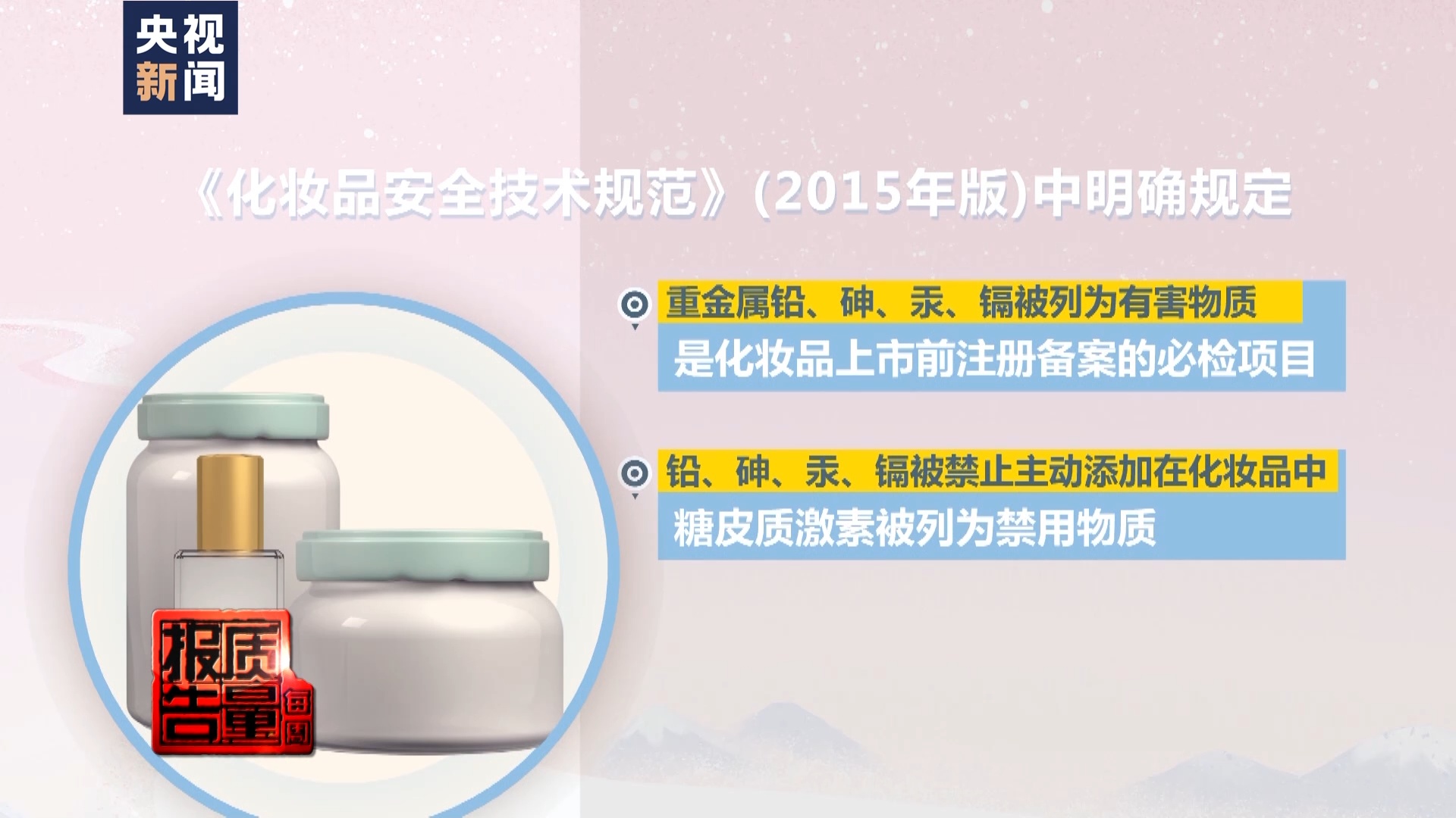 檢測專家向記者介紹,《化妝品安全技術規范》(2015年版)中明確規定,重金屬鉛、砷、汞、鎘被列為有害物質,是化妝品上市前注冊備案的必檢項目。鉛、砷、汞、鎘被禁止主動添加在化妝品中,糖皮質激素被列為禁用物質。