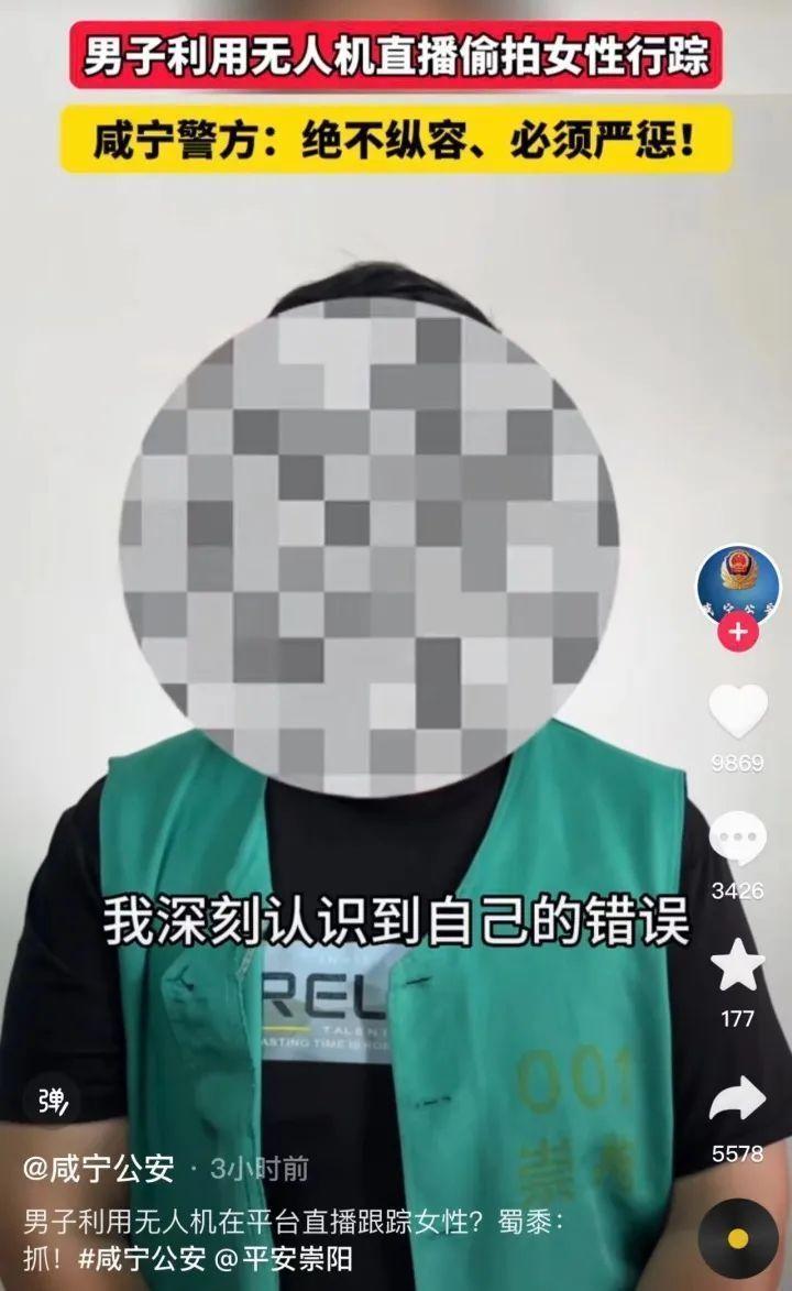 6日,咸寧市公安局網安大隊表示,事發咸寧崇陽,該男子汪某用無人機偷拍女性行蹤并在網絡直播,造成惡劣影響,涉嫌尋釁滋事,目前該男子已被查處。9月4日,汪某被處以行政拘留10日,該處罰已于當日開始執行。