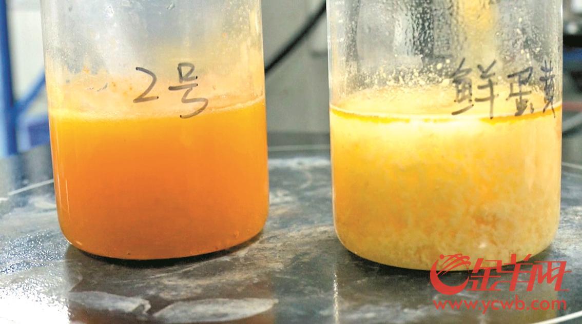 實驗室用生鮮咸鴨蛋取蛋黃檢測對照,發現生鮮咸蛋黃中每100克樣品中淀粉含量為0.2克。秦應昌介紹,除了2號外的其他5個樣品沒有檢測出添加劑,“經過對比實驗判斷應該是真的蛋黃。”而2號樣品不是真正的蛋黃,是改變了物理性狀的蛋制品。