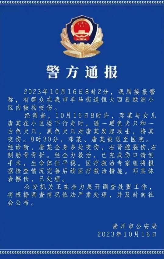 經調查,10月16日8時許,鄧某與女兒唐某在小區樓下行走時,遇一黑色犬只和一白色犬只,黑色犬只對唐某發起攻擊,將其咬傷。8時30分,鄧某、唐某被送至醫院。經診斷,唐某全身多處咬傷,右腎挫裂傷,右側肋骨骨折。經全力救治,已完成傷口清創手術,生命體征平穩。醫療救治專家組將根據檢查情況完善后續醫療救治措施。鄧某體表擦傷,已處理。