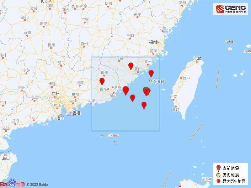 根據中國地震臺網速報目錄,震中周邊200公里內近5年來發生3級以上地震共23次,最大地震是2018年11月26日在臺灣海峽發生的6.2級地震(距離本次震中124公里)。