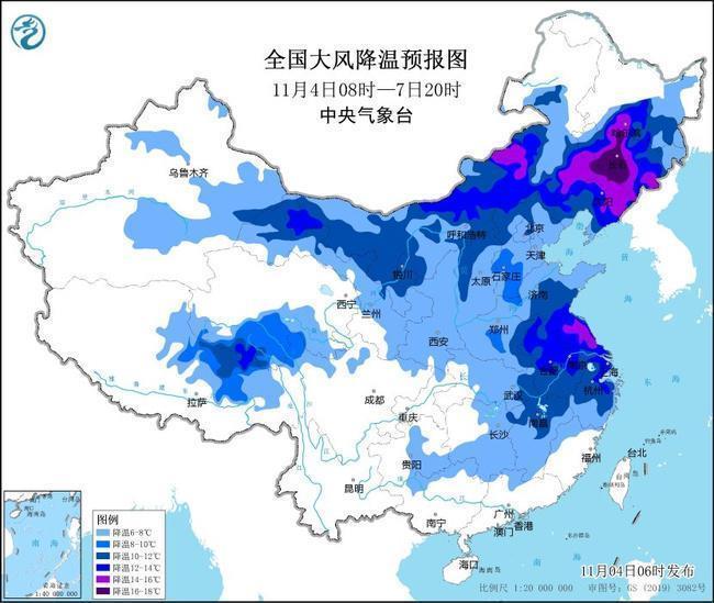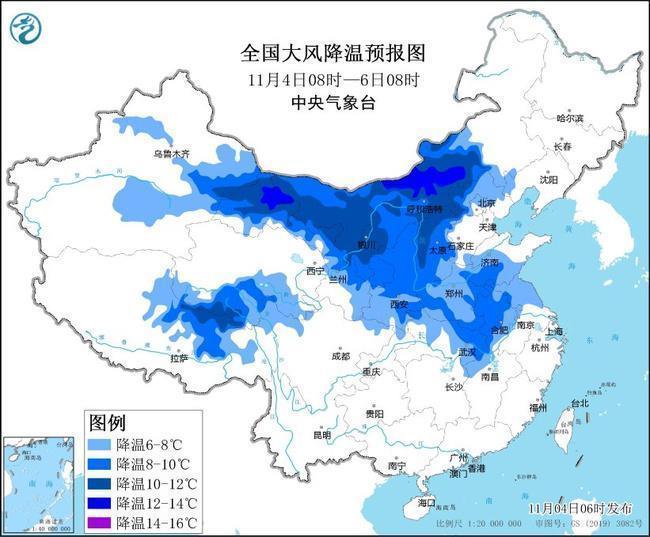 中央氣象臺11月4日06時繼續發布寒潮藍色預警: