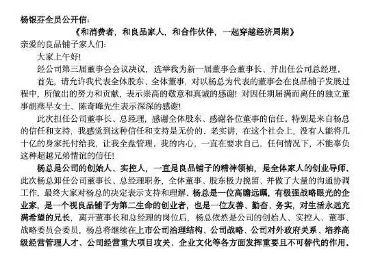 在公開信中,楊銀芬稱:“一系列變革的背后,核心目的只有一個(gè):回歸良品鋪?zhàn)余徏倚蜗螅呦蚱焚|(zhì)好、價(jià)格親民的路線。不變,我們真的有可能失去在牌桌上的資格。”