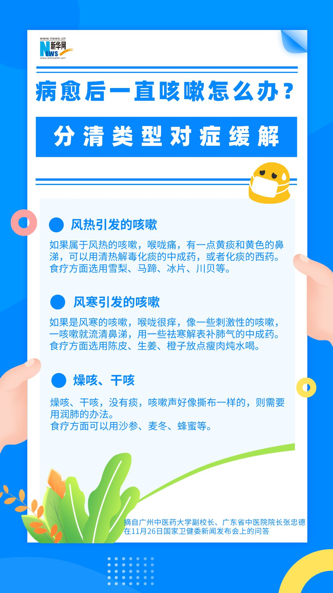 在11月26日召開的國家衛健委新聞發布會上,廣州中醫藥大學副校長、廣東省中醫院院長張忠德也對孩子康復后一直咳嗽的情況作出解答。