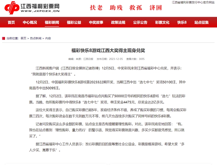 江西福利彩票網對大獎得主的報道。