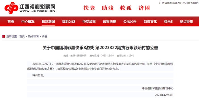12月2日,中國福利彩票“快樂8”第2023322期開獎,按照以往開獎信息發布速度,開獎情況大概每天22時左右就會出爐,可是當晚足足晚了一個多小時。“選七”和“選五”中獎無數,把獎池都中爆了,均觸發最大返獎總額風險控制。按照《中國福利彩票快樂8游戲風險控制方案》,各獎等單注中獎獎金以開獎公告為準。