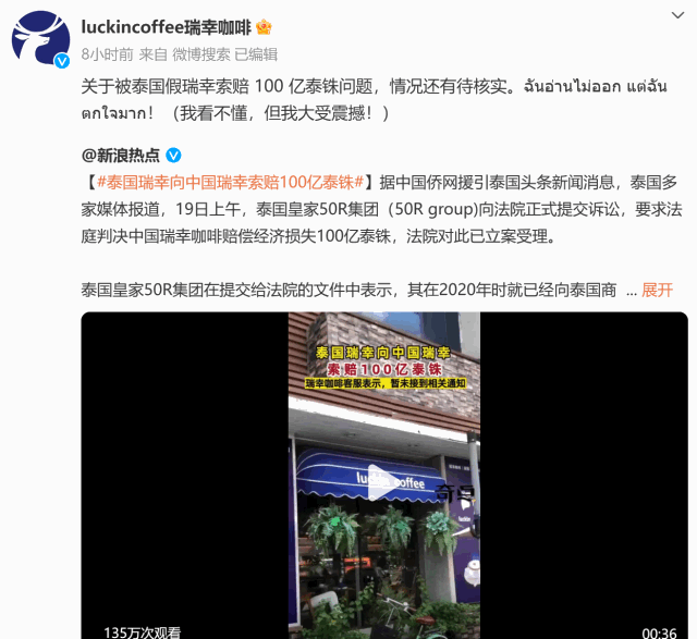 12月20日,瑞幸咖啡官方微博就19日泰國知識產權和國際貿易中央法庭審判一事,發布消息回應稱,關于被泰國假瑞幸索賠100億泰銖問題,情況還有待核實。