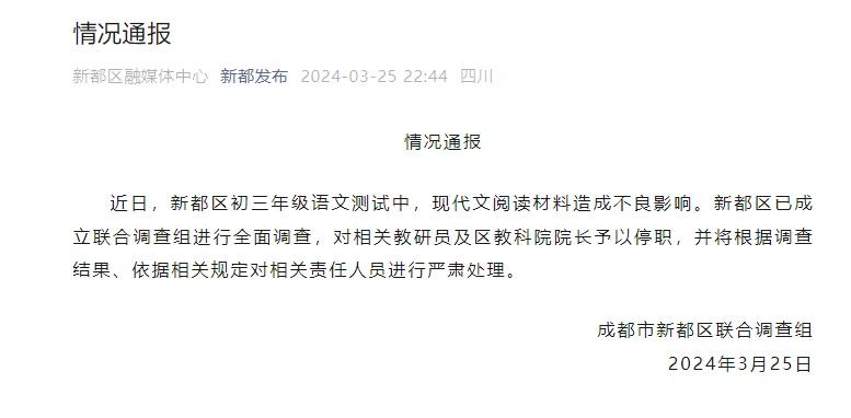 3月25日晚,成都新都區通報“初三語文試卷內容影響不良”: