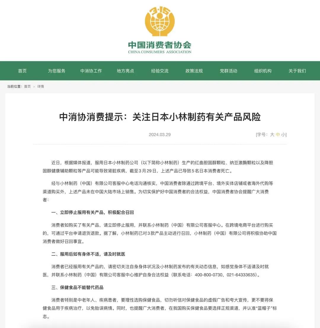 近日,根據媒體報道,服用日本小林制藥公司(以下簡稱小林制藥)生產的紅曲膽固醇顆粒、納豆激酶顆粒以及降膽固醇健康輔助顆粒等產品可能導致腎臟疾病,截至3月29日,上述產品已導致5名日本消費者死亡。