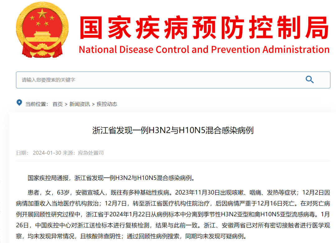 2024年1月30日,國家疾控局通報,浙江省發現一例甲型流感病毒H3N2與禽流感病毒H10N5混合感染病例。