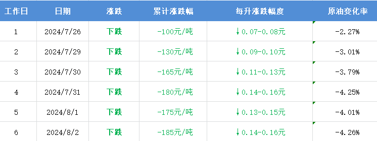 國內油價將在8月8日24時(本周四晚12點)進行下半年第3次調整。本輪國內油價計價統(tǒng)計周期第6個工作日,參考原油變化率-4.26%,預計汽柴油下調185元/噸,折算為每升油價下跌0.14-0.16元。