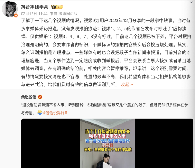 2月12日,抖音集團(tuán)副總裁李亮在微博發(fā)文談及視頻“擺拍”亂象。他表示,平臺(tái)對(duì)擺拍治理是明確的,會(huì)要求作者做標(biāo)識(shí),不做標(biāo)識(shí)的擺拍內(nèi)容核實(shí)后會(huì)按違規(guī)處理。“怎么識(shí)別擺拍是治理難點(diǎn),一些媒體有時(shí)也會(huì)誤把段子當(dāng)作新聞來(lái)報(bào)道。目前抖音的治理措施是,當(dāng)某個(gè)事件達(dá)到一定熱度或收到舉報(bào)后,平臺(tái)會(huì)聯(lián)系當(dāng)事人核實(shí)或者請(qǐng)當(dāng)?shù)孛襟w去調(diào)查,在有明確的結(jié)論前,相關(guān)內(nèi)容會(huì)暫停推薦。”