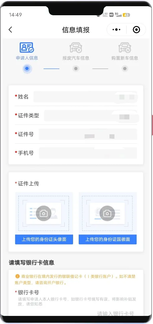③根據提示,填寫申請人信息、報廢汽車信息、購置新車信息,即可申請汽車以舊換新補貼。
