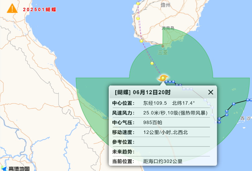 記者從海南省氣象部門了解到,今年第1號臺風“蝴蝶”已于12日20時由熱帶風暴級加強為強熱帶風暴級,其中心位于北緯17.4度、東經109.5度,也就是在海南省三亞市偏南方向約95公里的南海中西部海面上,距離海口市303公里,中心附近最大風力10級(25米/秒),中心最低氣壓為985百帕,七級風圈半徑100-260公里。