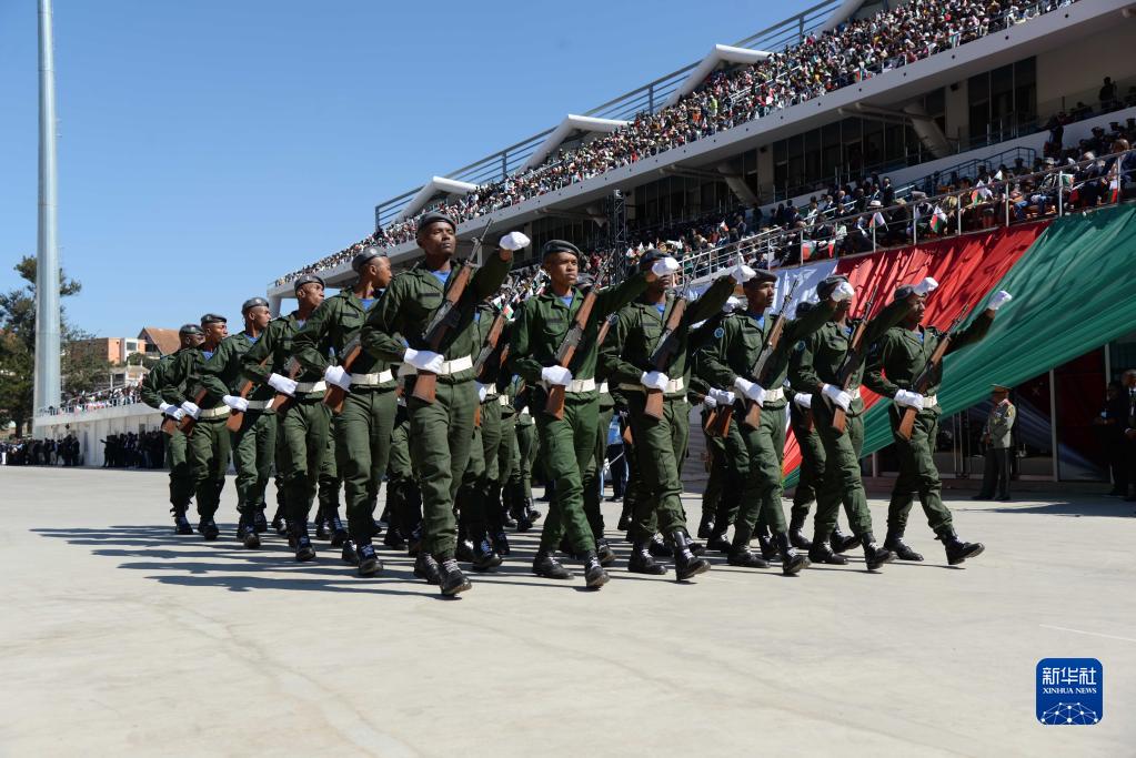 6月26日,在馬達(dá)加斯加首都塔那那利佛,馬達(dá)加斯加軍人列隊接受檢閱。