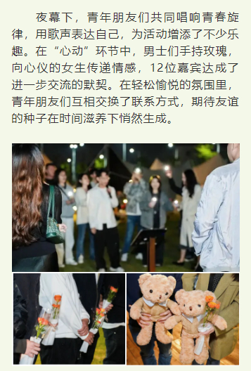 夜幕下,青年朋友們共同唱響青春旋律,用歌聲表達(dá)自己,為活動(dòng)增添了不少樂(lè)趣。在“心動(dòng)”環(huán)節(jié)中,男士們手持玫瑰,向心儀的女生傳遞情感,12位嘉賓達(dá)成了進(jìn)一步交流的默契。在輕松愉悅的氛圍里,青年朋友們互相交換了聯(lián)系方式,期待友誼的種子在時(shí)間滋養(yǎng)下悄然生成。