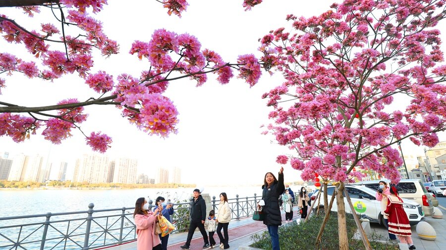 1月31日,在冬日暖陽下,陸陸續續有市民來打卡,邂逅浪漫的紫花風鈴。走近紫花風鈴木,只見滿樹枝頭都是一簇簇紫紅色的花朵,整株樹幾乎沒有葉片,猶如編織了一個紫色的風鈴。漫步其中,讓人在冬天里享受春天的感覺。
