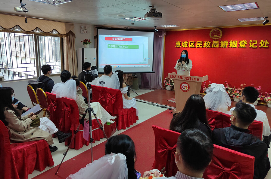 2月14日,惠城區婚姻登記處共為130對新人辦理婚姻登記。記者從市民政局了解到,當天惠州各縣(區)民政局婚姻登記處同步舉行集體頒證儀式,全市共有400多對新人集體登記領證。
