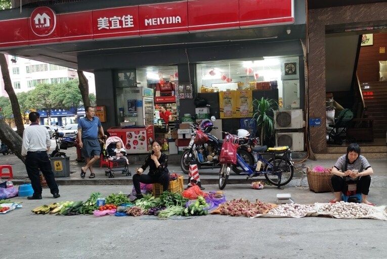 4月17日17時38分,在惠城區橋東市場,停放電動車的格子上被擺上了青菜售賣。