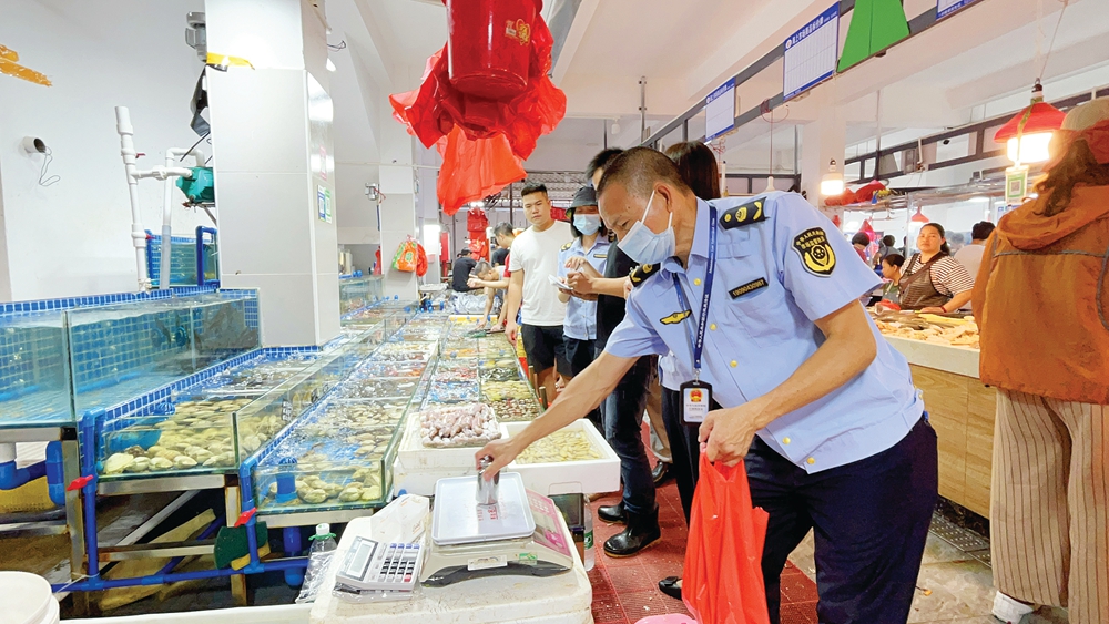 執(zhí)法人員在惠東港口濱海旅游度假區(qū)的海鮮市場(chǎng)開展“清秤大行動(dòng)”;葜萑?qǐng)?bào)記者洪鵲兒 攝