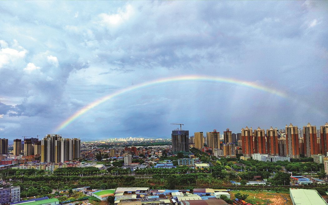 8月11日15時48分,惠州市氣象臺發布惠城區暴雨黃色預警信號。17時許,一場短暫暴雨過后,一道彩虹出現在市區江北天空,不少路人紛紛停下腳步記錄這一時刻,大約5分鐘后彩虹漸漸消失。