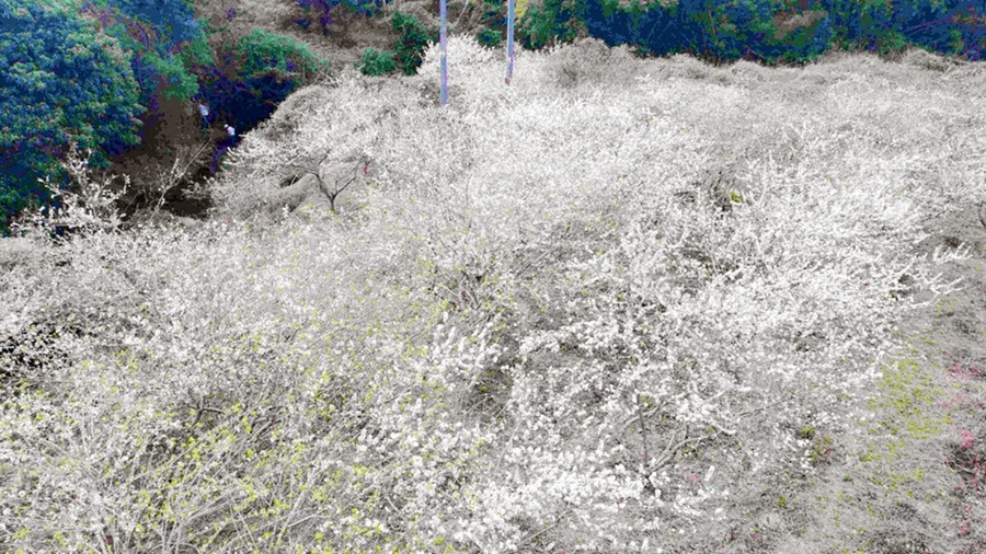 站在遠處望去,李子園里白茫茫的一片。沿著山邊、溪邊,呈帶狀分布的大片李花,如一條大大的白絲帶般飄逸,裝飾著溪澗、林間。