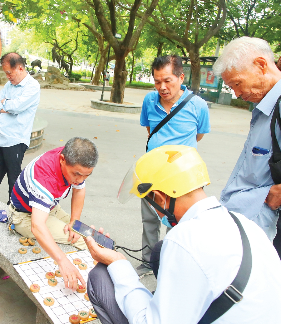 幾位老年人在南湖公園下棋,不亦樂乎。