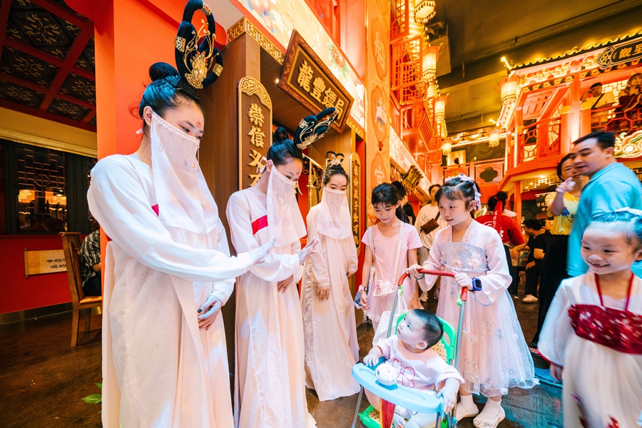 唐裝仕女,唐宮御宴,大唐市集,唐風(fēng)布景……在“燈船”大唐不夜城,每一處都在綻放著文化魅力。自開(kāi)業(yè)以來(lái),其獨(dú)具特色的沉浸式餐飲體驗(yàn)吸引了許多游客前來(lái)打卡就餐。