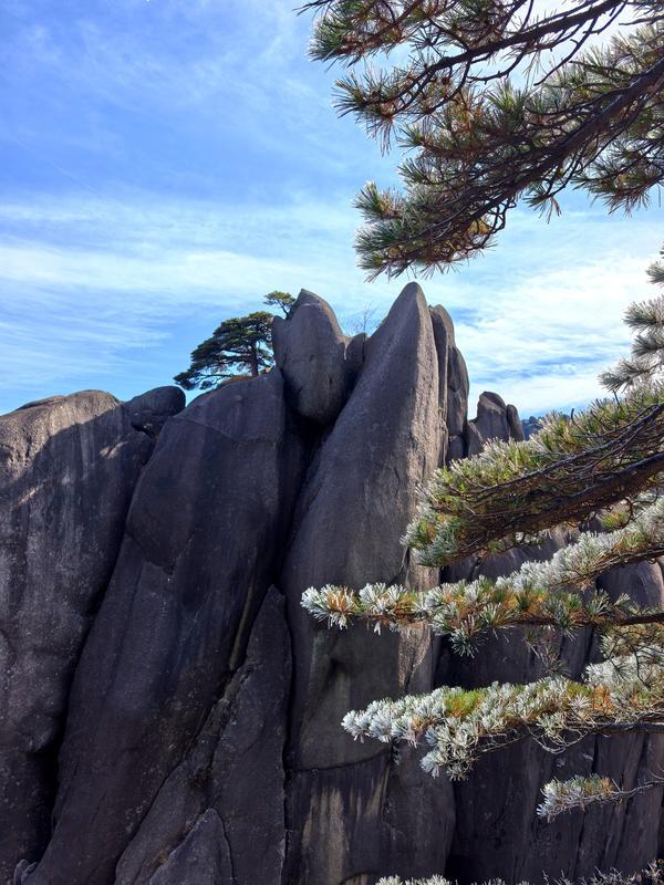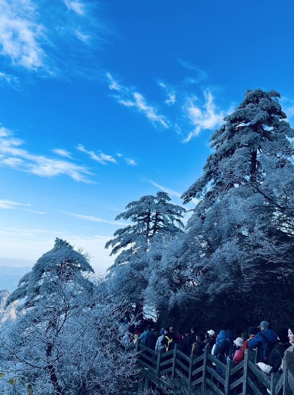 第四天重頭戲:登黃山。大美黃山依然歲月繾綣葳蕤生香,英姿挺拔傲視群雄。昨晚溫度驟降產生的霧凇今朝陽光照耀下熠熠生輝,隊友們個個摩拳擦掌全力以赴。纜車緩緩上升,所見之處皆是突兀的青黑巨石上一大片一大片的不老松,尉為壯觀。包括6位70歲長者在內27人全體通過崎嶇陡峭的“好漢坡”,在聞名遐邇的迎客松前留下自己的形象。登上光明頂的17位勇士有7位60歲以上,他們在布滿冰晶與霧凇的蜿蜒狹窄道路上奮勇前行。隊友們團結互助相互攙扶互相配合,征服奇山險峰挑戰自我,夢想成真不留遺憾……聽,凱旋歸來的笑聲多么爽朗,江山如畫我們亦是豪杰。